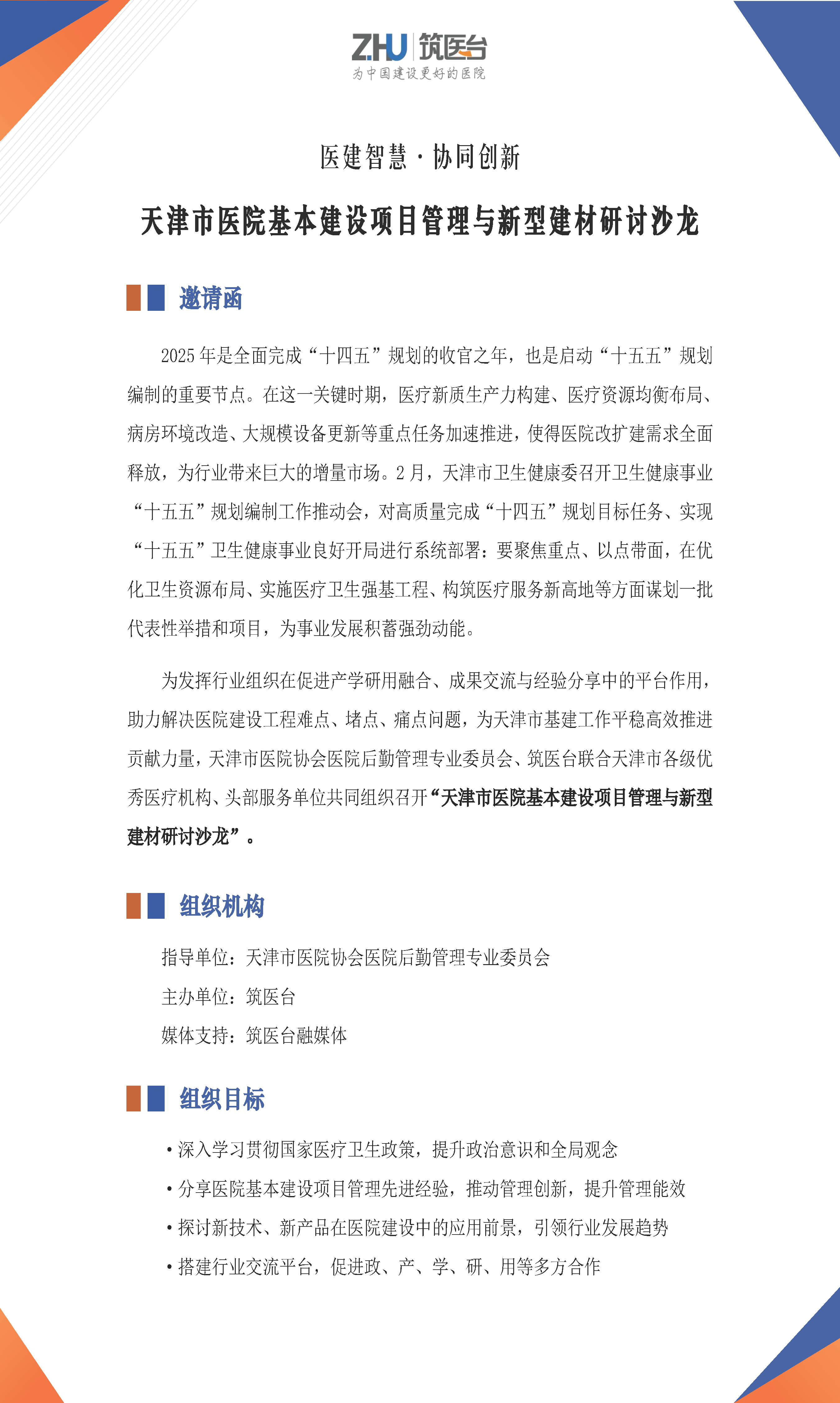 为发挥行业组织在促进产学研用融合、成果交流与经验分享中的平台作用,助力解决医院建设工程难点、堵点、痛点问题,为天津市基建工作平稳高效推进贡献力量,天津市医院协会医院后勤管理专业委员会、筑医台联合天津市各级优秀医疗机构、头部服务单位共同组织召开“天津市医院基本建设项目管理与新型建材研讨沙龙”。